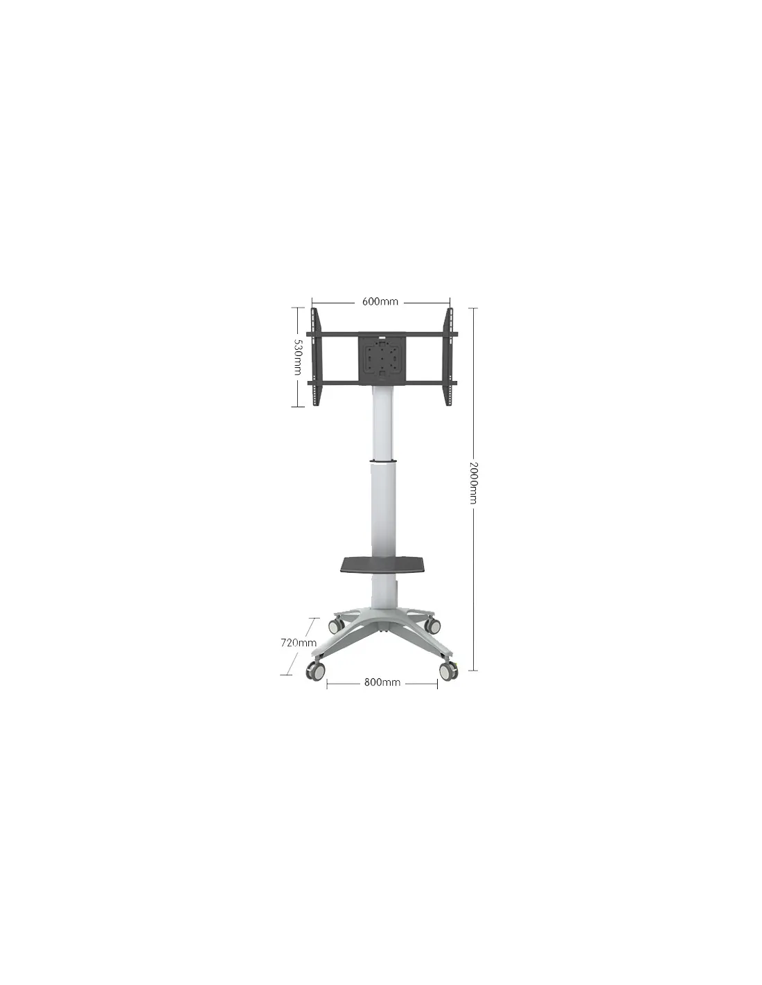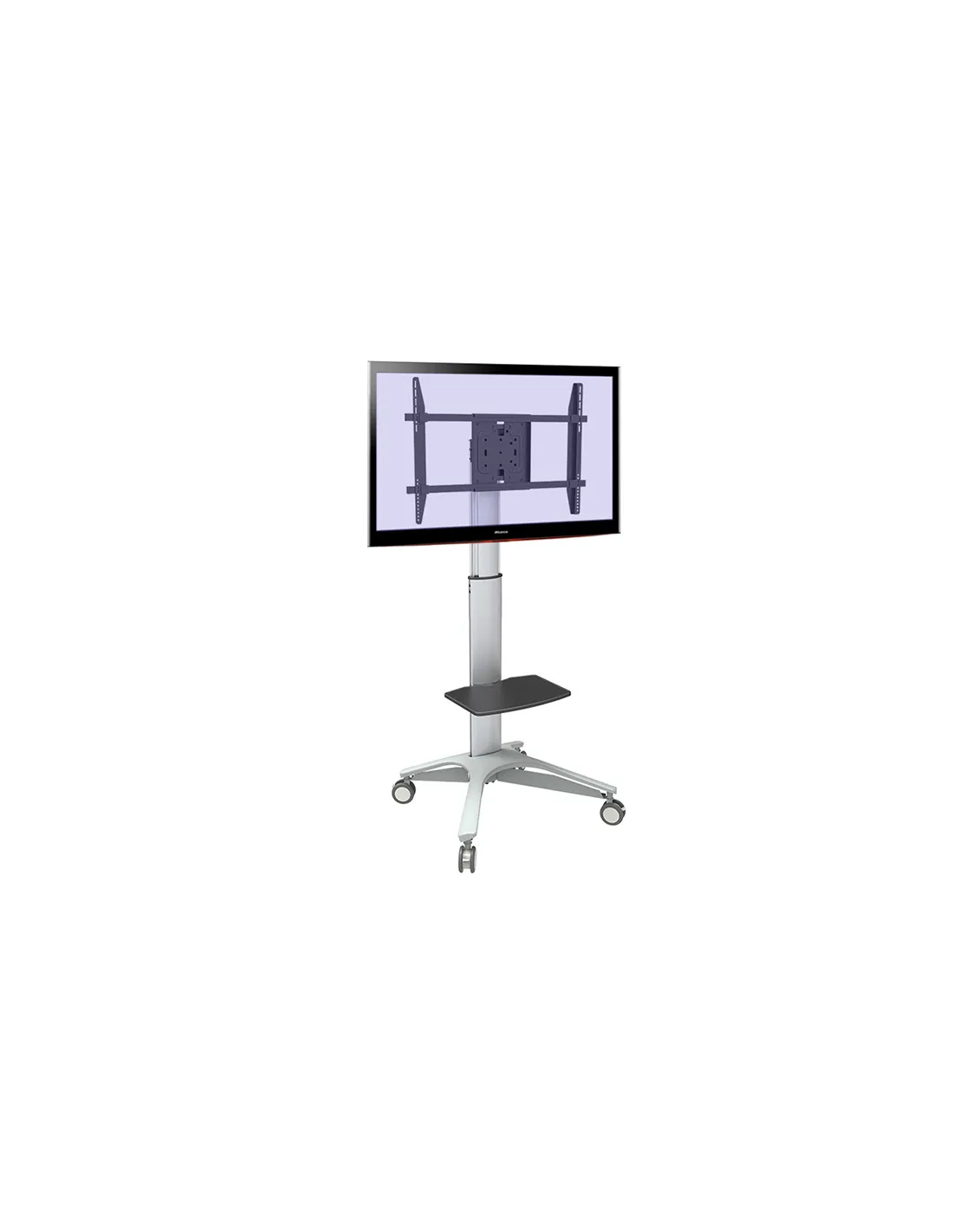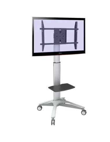Ce support mobile pour écran plat en alu avec tablette PVC présente un design élégant. La hauteur de la platine peut être réglée de 120 à 175cm. Elle supporte tous les écrans en VESA max. 400x400, elle est inclinable et permet l'orientation portrait / paysage. La tablette aussi peut être réglée en hauteur. La gestion des câbles est prévue.